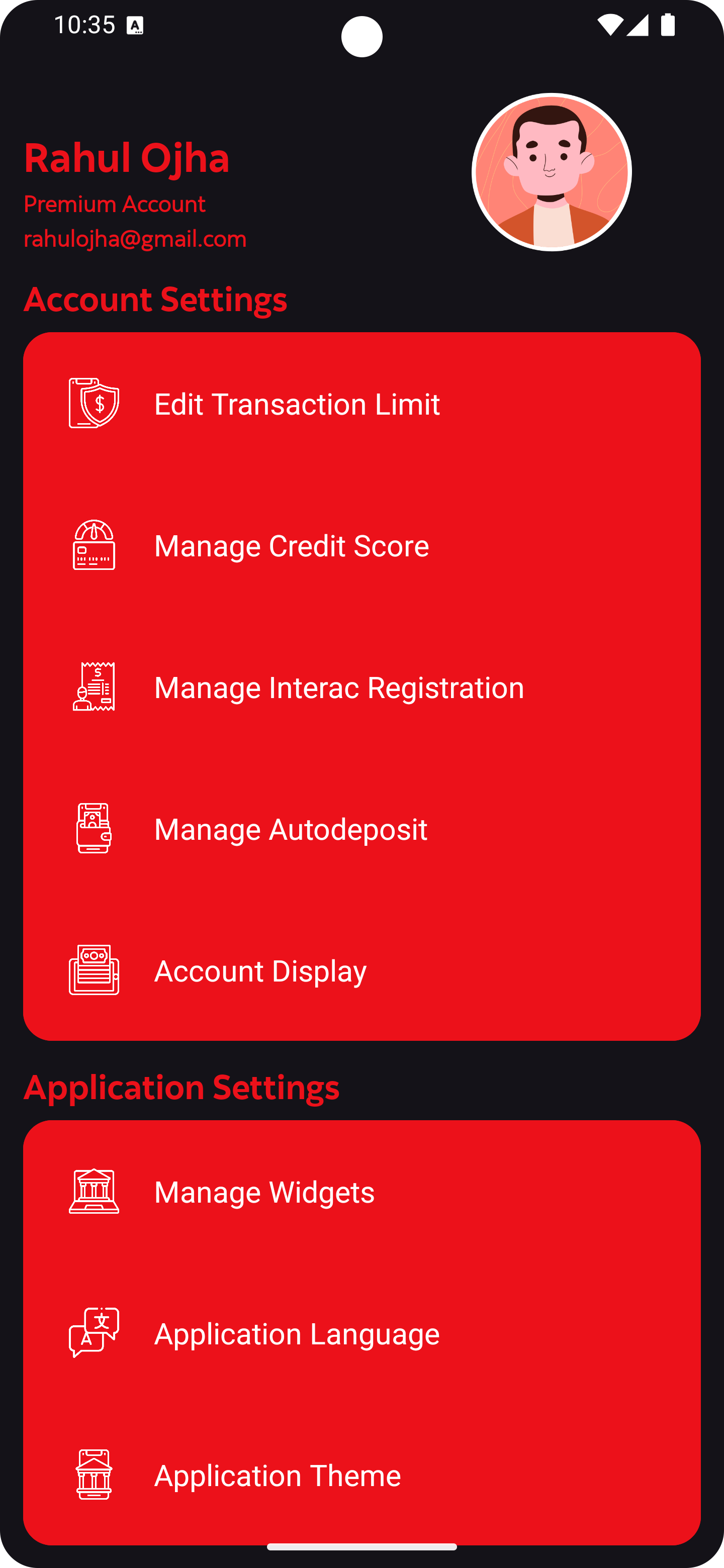 This activity displays the Cards Details screen of my Bank Android Application, built with Java in Android Studio and integrated with Firebase Cloud Database. The design, a clone of Scotiabank’s interface, features a modern dark theme with red accents, creating a user-friendly and visually appealing dashboard for logged-in users. Real-time data via Firebase keeps the balance and details current, aligning with banking app standards.