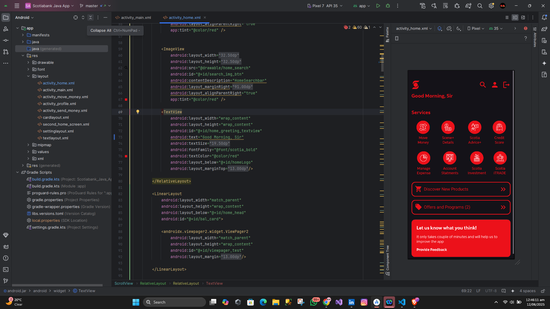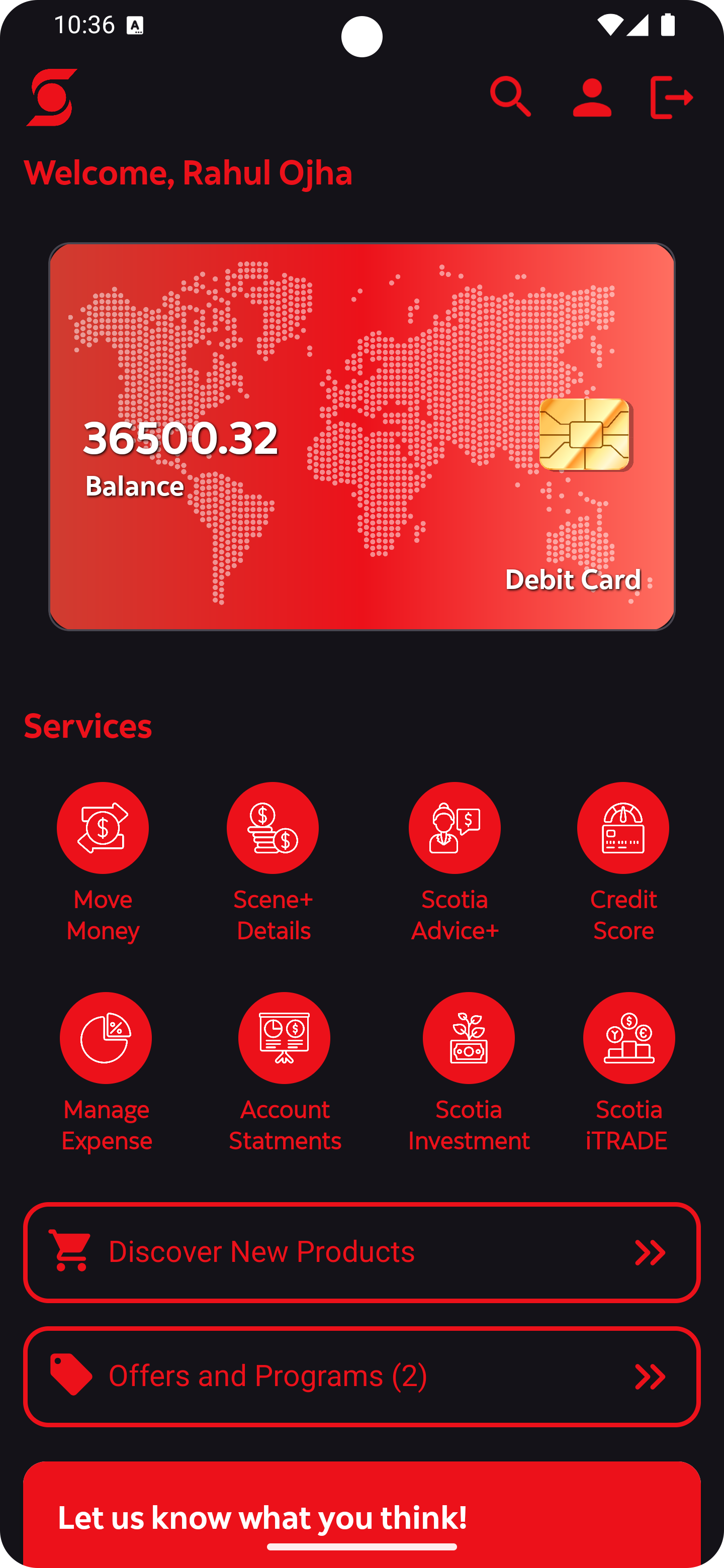 The Services section offers eight icons (Move Money, Scene+ Details, Scotia Advice+, Credit Score, Manage Expense, Account Statements, Scotia Investments, Scotia iTRADE) for easy navigation. Buttons for Discover New Products and Offers and Programs (2), plus a "Let us know what you think!" banner, enhance engagement. This showcases my UI/UX and Android development skills for a portfolio.
