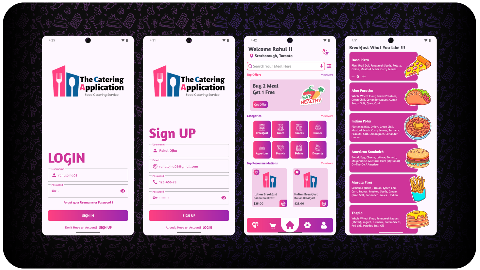 Food enthusiasts and event planners needed a centralized platform to discover and book catering services with ease. Many platforms were outdated, cluttered, or lacked real-time updates. To fill this gap, I created a responsive Android application that offers a clean, modern UI, dynamic content, and secure backend interactions using SQL and Retrofit APIs.