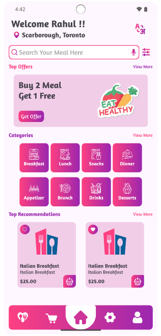 The Home screen highlights a categorized display of food items with prices and images. Users can add items to their cart, view summaries, and schedule orders. The backend ensures that orders are stored securely in a SQL database, with real-time updates made possible using Retrofit RESTful APIs.